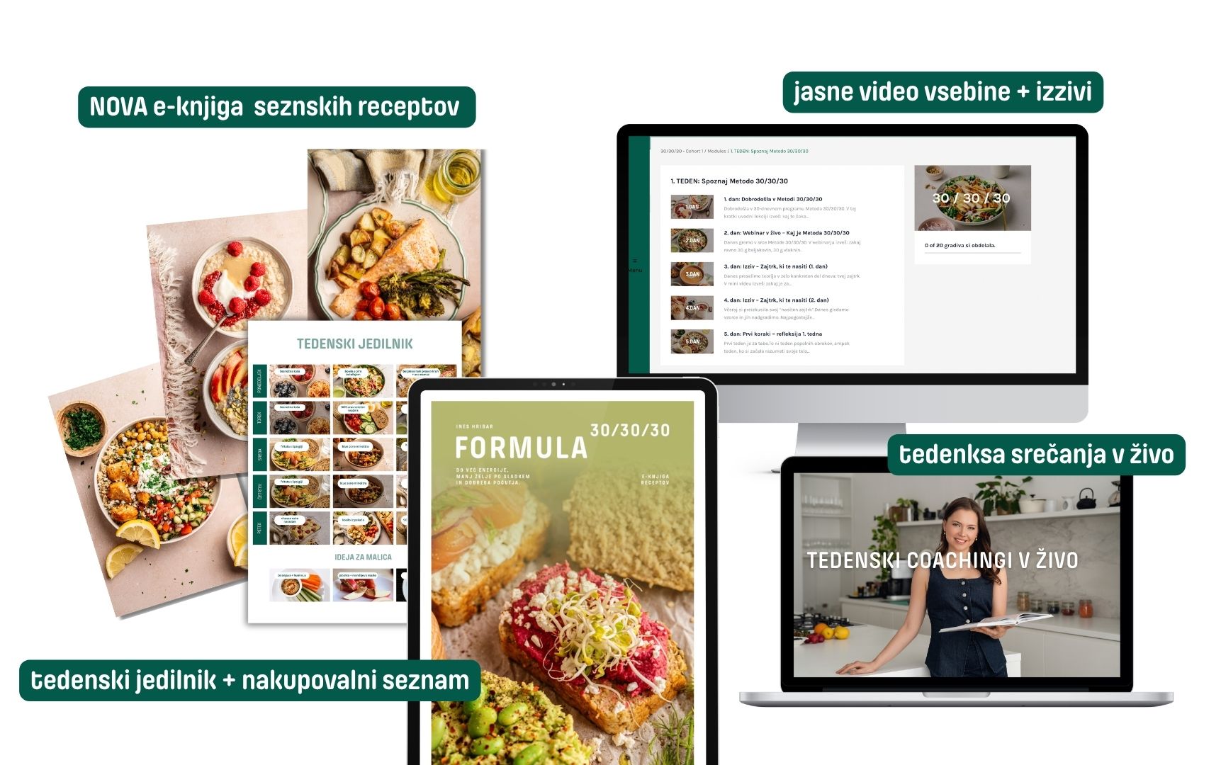 zasnovan po principih Formule 30:30:30. Najdeš ideje za sladke in slane zajtrke, kosila, večerje ter malice.